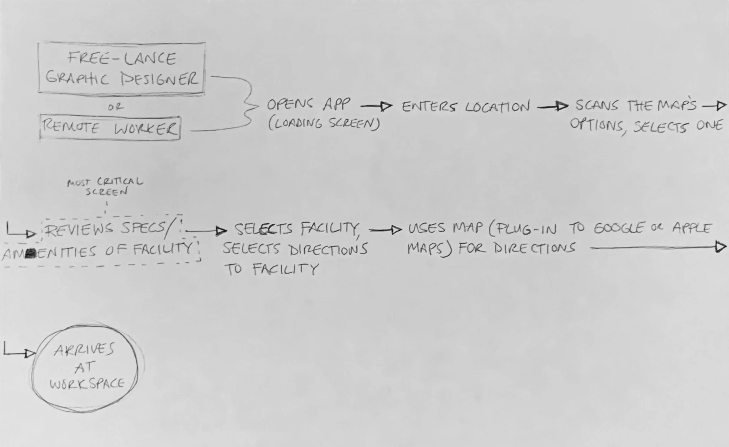 This is the first process to get the “visualization wheels” turning. Here, I have decided who I am designing for and what the end goal is. In between the who and the what, are the steps that the user must take to complete the journey. During this process I pictured the steps as screens and the arrows as transitions. Absolutely nothing in this workflow is permanent but it is the foundation of ideas, moving forward.